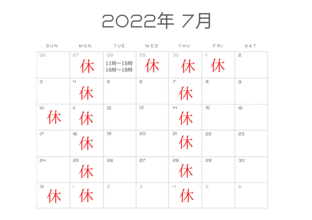 2022年7月の営業日です。7月1日㈮・10日㈰・31日㈰はお休みをいただきます。